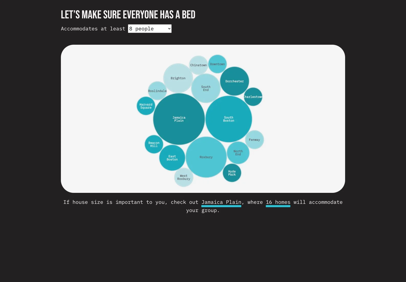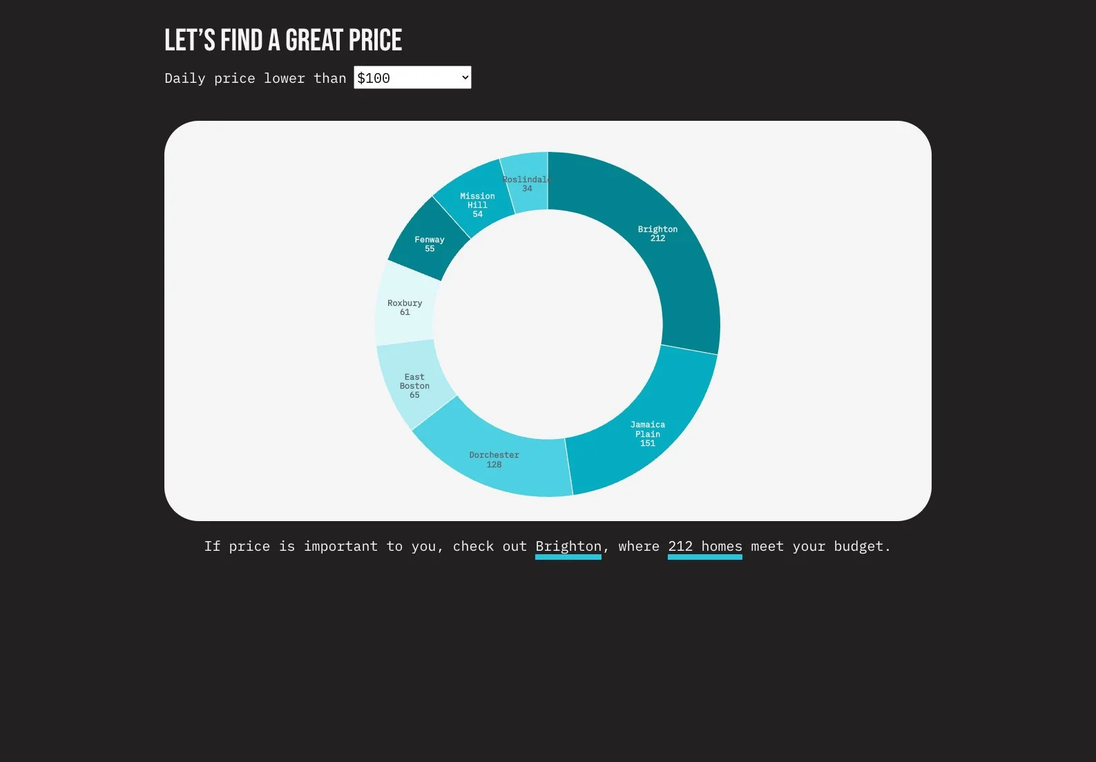 Introduction: This project aims to help users find the perfect Airbnb for their gathering by visually interpreting the Boston Airbnb open data set. Using D3.JS JavaScript Library, we will create interactive data visualizations that allow users to easily explore and compare various Airbnb options based on three key factors: number of guests, neighborhood, and price. The charts we considered are radar slider chart, bubble chart, sunburst chart, pie chart, and donut chart.