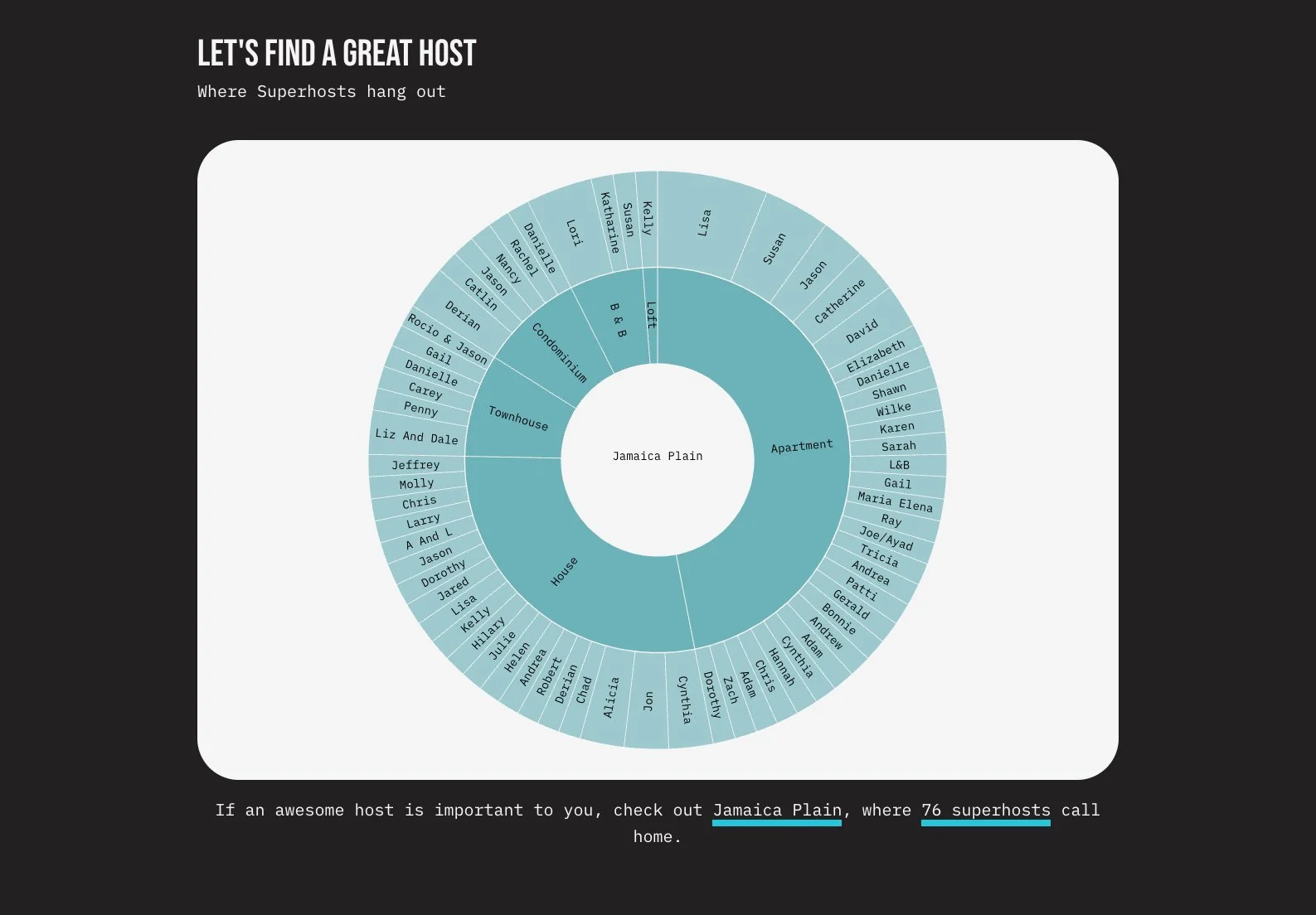 D3.JS Visualization: Using D3.JS, we will create interactive visualizations that allow users to explore the data and select the right Airbnb for their gathering. The visualizations will include a radar slider chart to show the number of guests each Airbnb can accommodate, a sunburst chart to indicate the number of super hosts in each neighborhood, and a pie chart, donut chart, or bubble chart to show the average price of Airbnbs in each area.